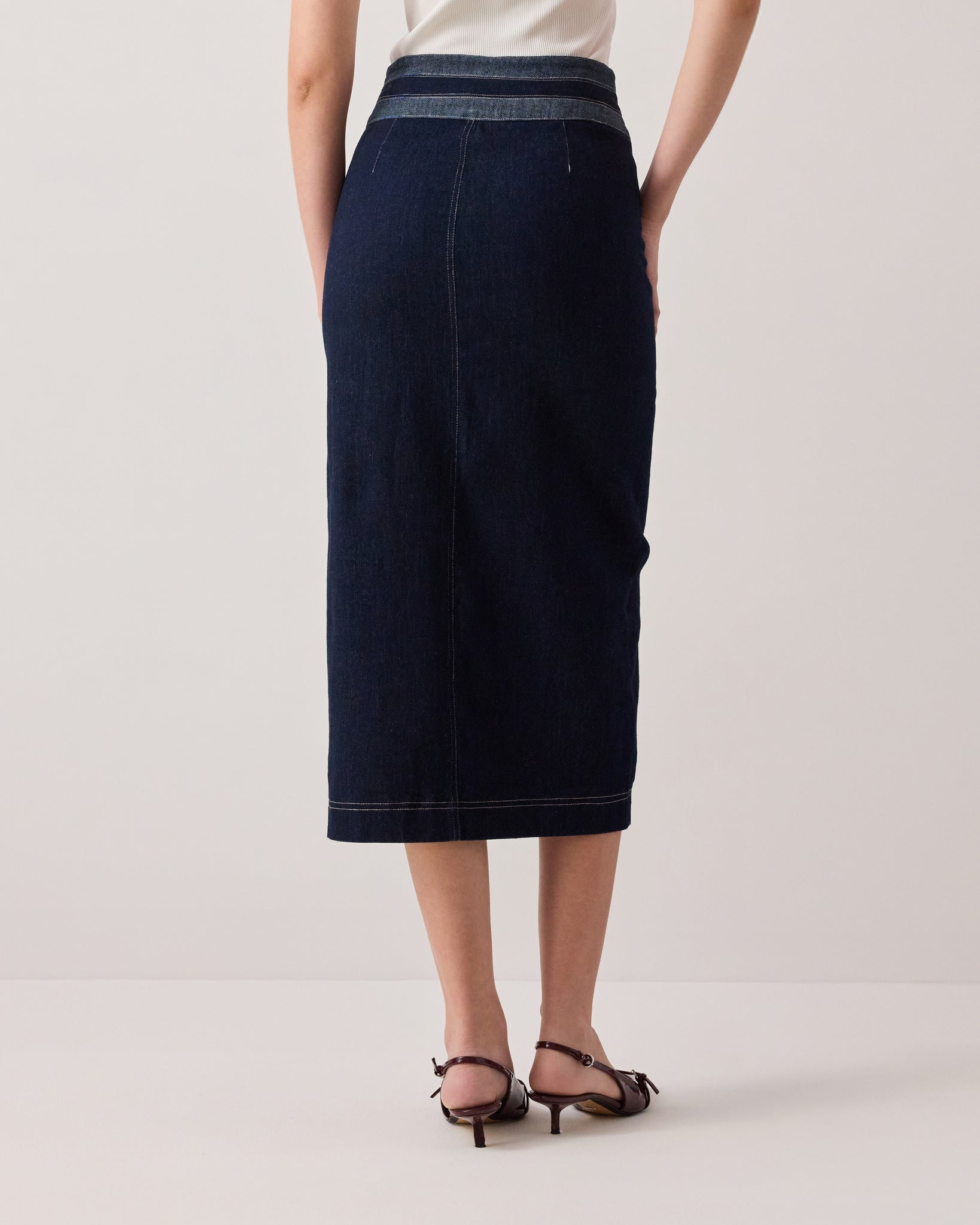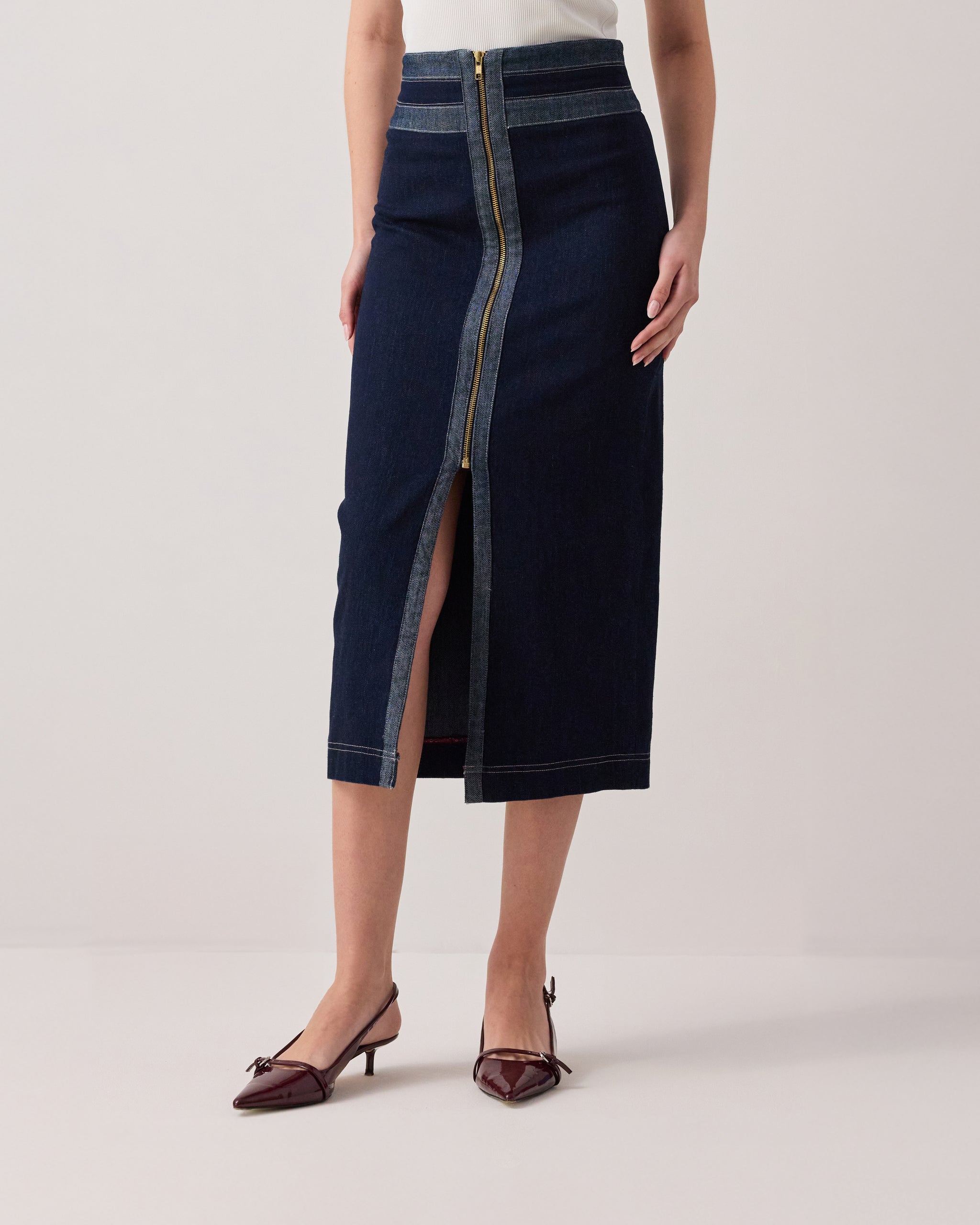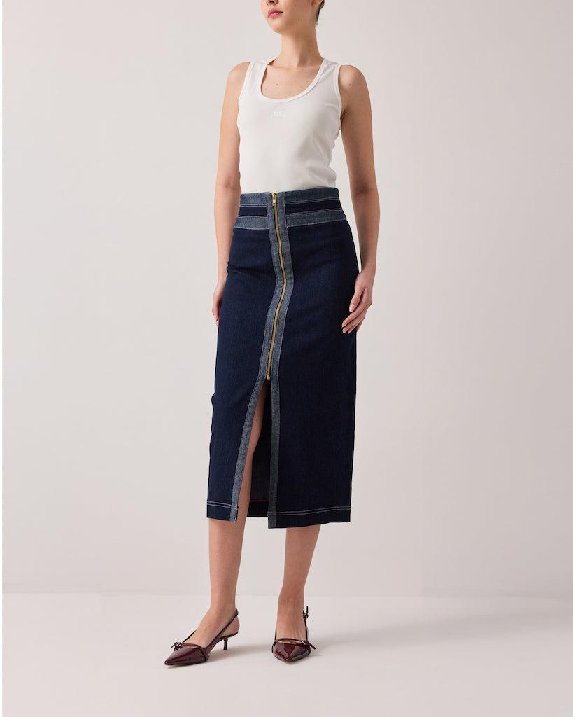 Renueva tu estilo con esta falda midi para mujer, confeccionada en denim. Su diseño moderno con abertura frontal con cremallera y corte ajustado aporta un toque contemporáneo y elegante, ideal para crear looks sofisticados con personalidad urbana.