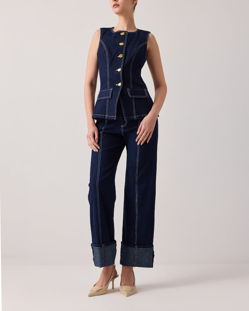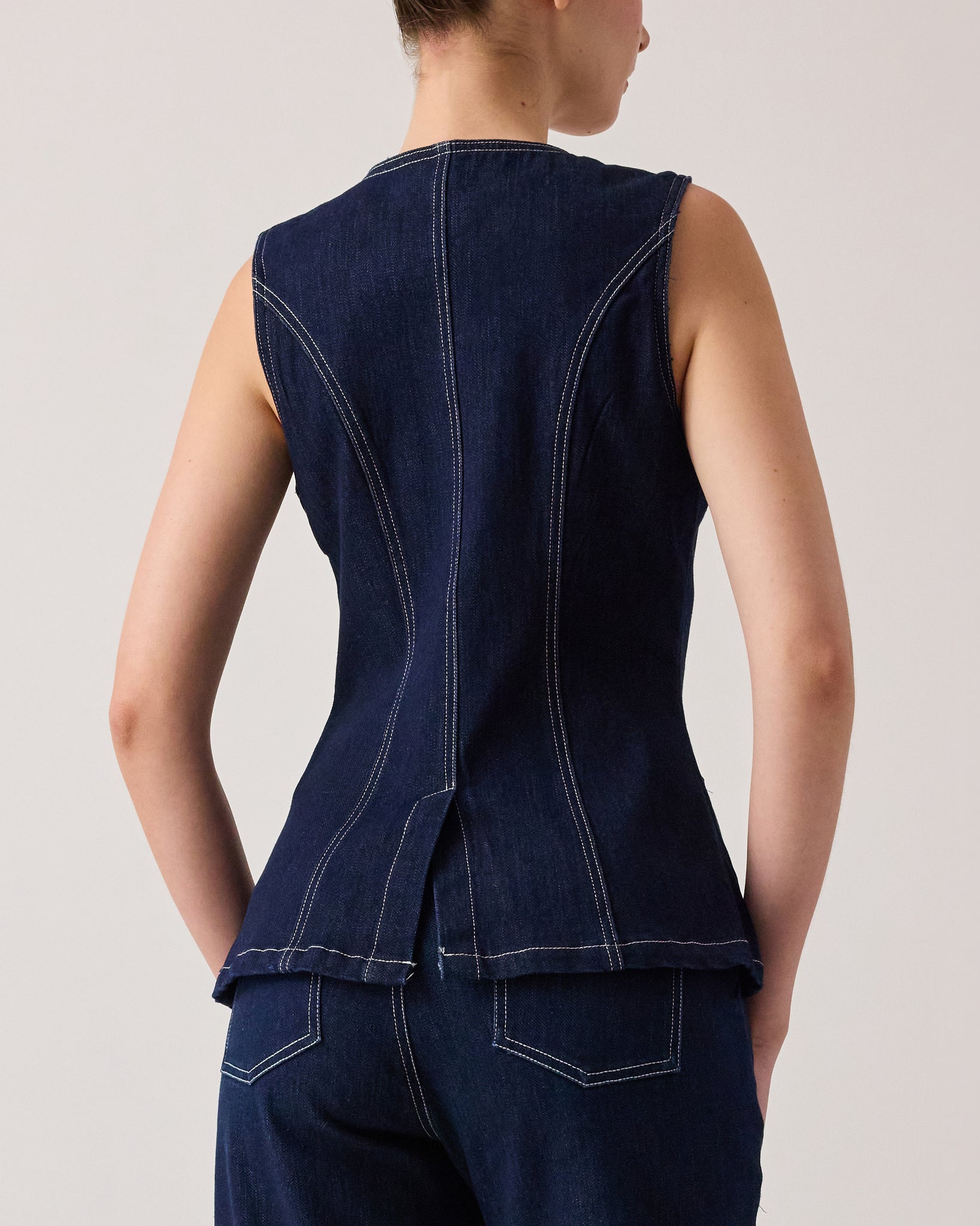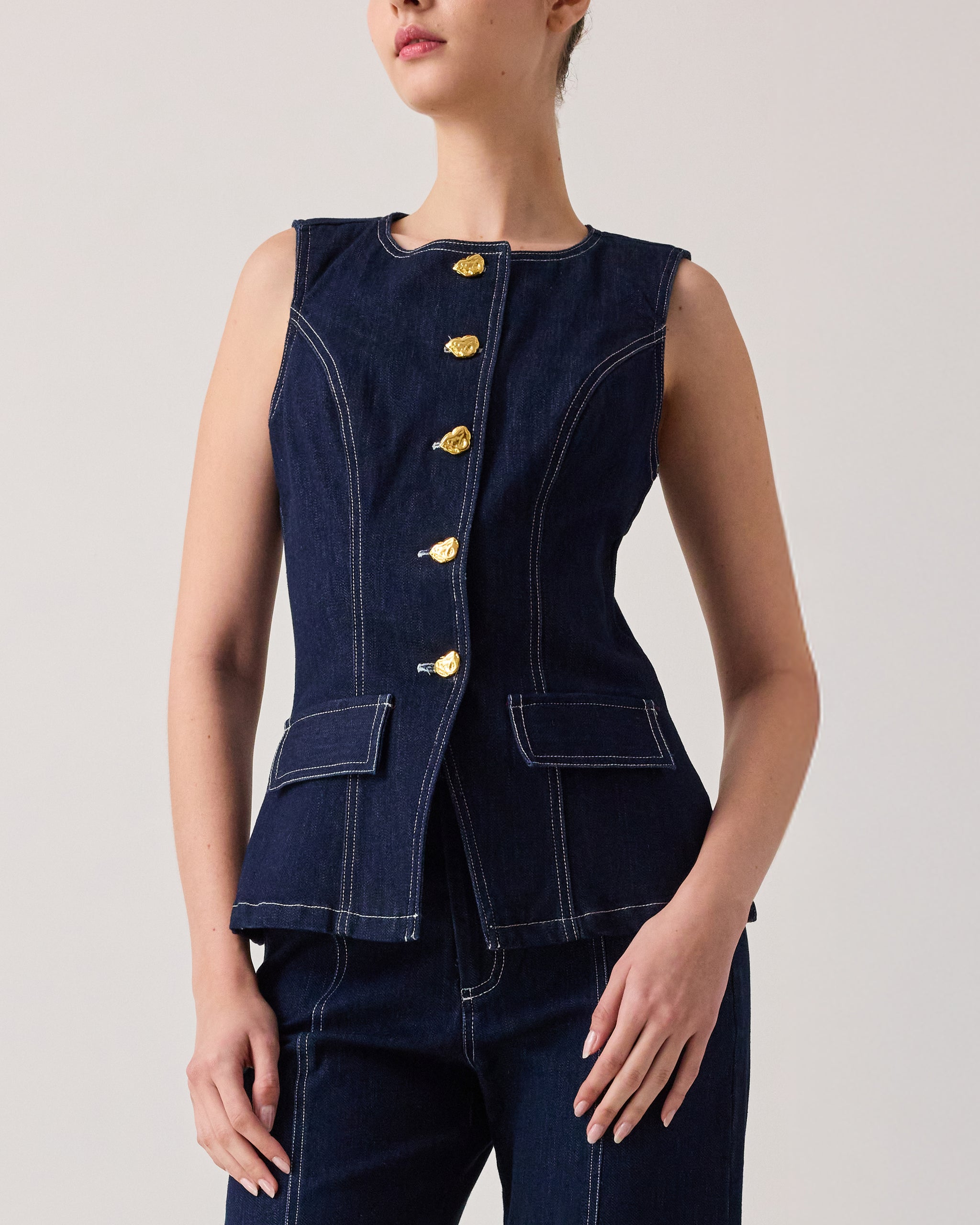 Renueva tu armario con este elegante chaleco de denim que fusiona la sofisticación del corte sastre con la versatilidad del mezclilla. Diseñado con una silueta entallada que realza la figura, este chaleco sin mangas presenta botones dorados en forma amorfa que aportan un toque femenino y distintivo. Los bolsillos de solapa falsos añaden un detalle clásico sin sacrificar la línea limpia del diseño.
