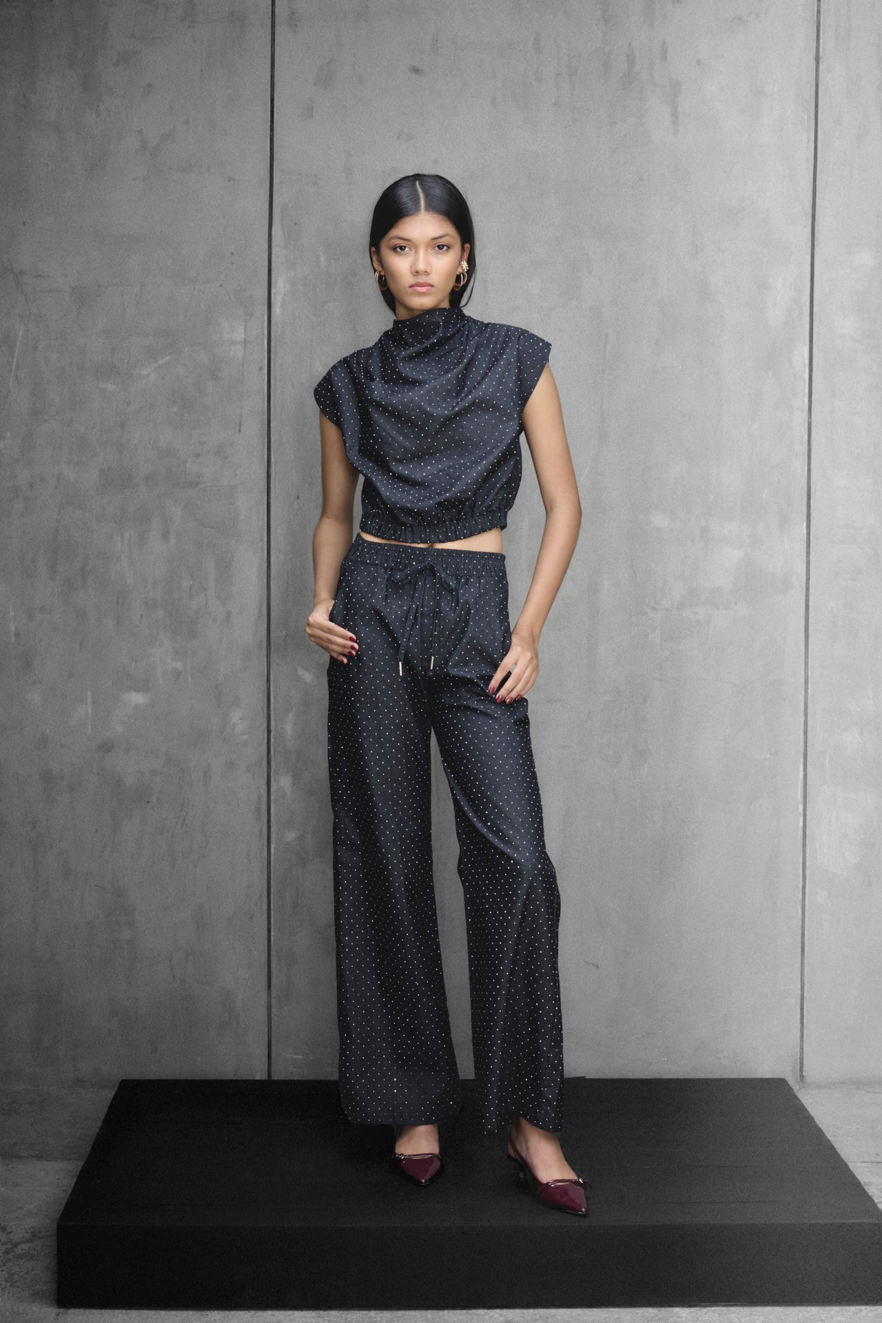 Eleva tu estilo con este pantalón para mujer, una prenda que combina elegancia relajada y diseño contemporáneo. Confeccionado en un tejido color negro con pedrería en contraste, ofrece un efecto visual sutil y refinado que eleva cualquier look. Su silueta de pierna ancha y caída fluida aporta movimiento, mientras que el talle medio con cordón ajustable realza la figura sin perder comodidad.