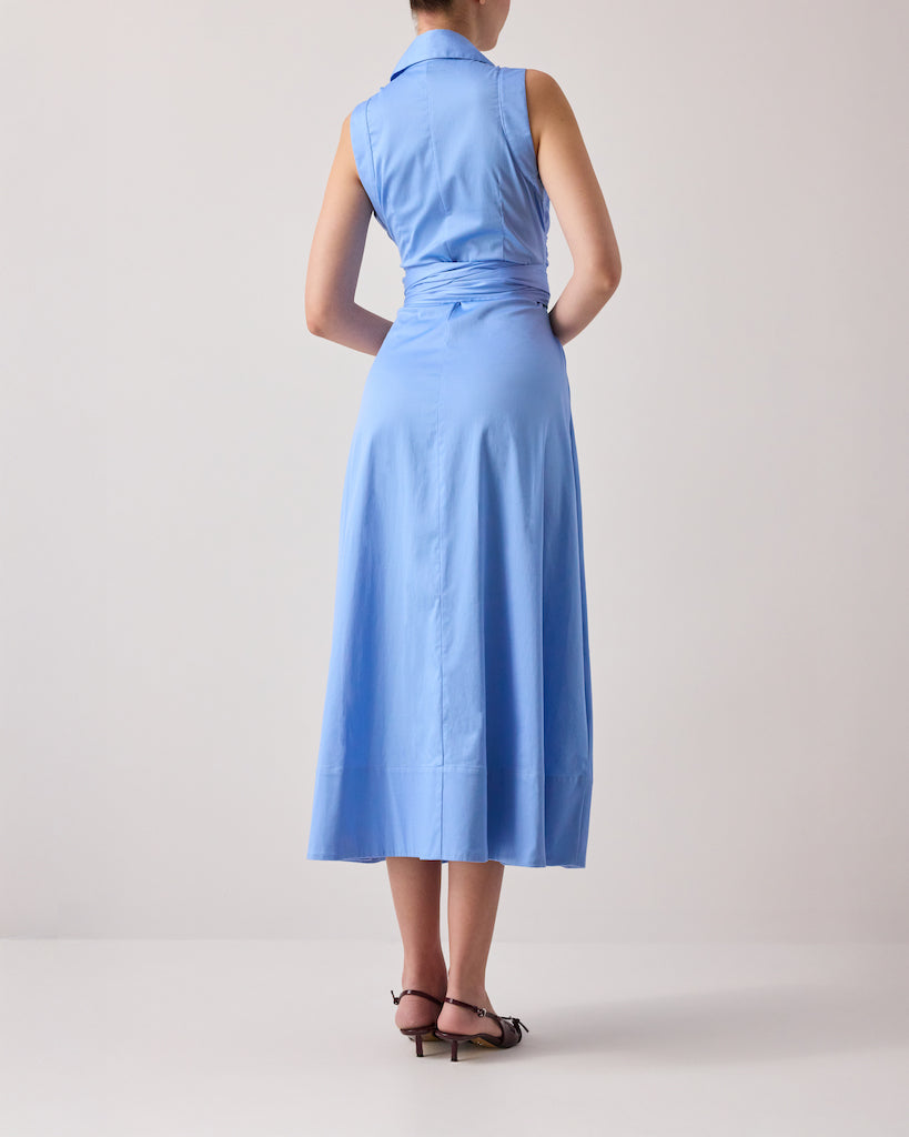 Romántico y sofisticado, este vestido camisero largo sin mangas es una declaración de estilo atemporal. Confeccionado en una tela fluida de acabado satinado, su color azul lavanda aporta frescura y elegancia. El diseño incluye un cuello camisero estructurado y un favorecedor cruce en el frente que define la cintura con una faja larga integrada que puede anudarse al gusto, creando una silueta femenina y esbelta. Ideal para climas cálidos o para superponer con blazer.